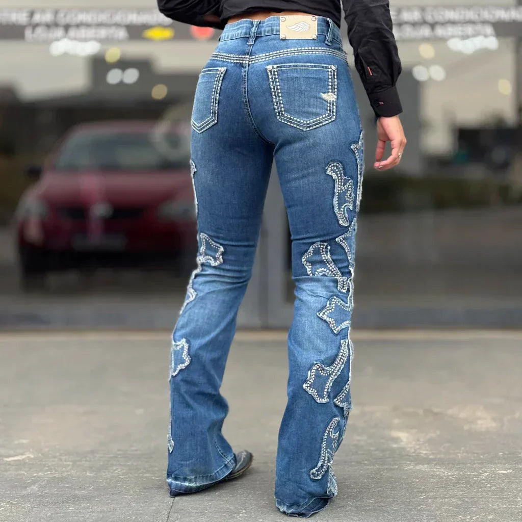 Confeccionada em jeans premium, com lavagem artesanal em azul médio e barra desfeita, é uma peça autêntica e cheia de personalidade. Ideal para rodeios, festas country e também para o dia a dia da cowgirl que busca qualidade e beleza em um só jeans.